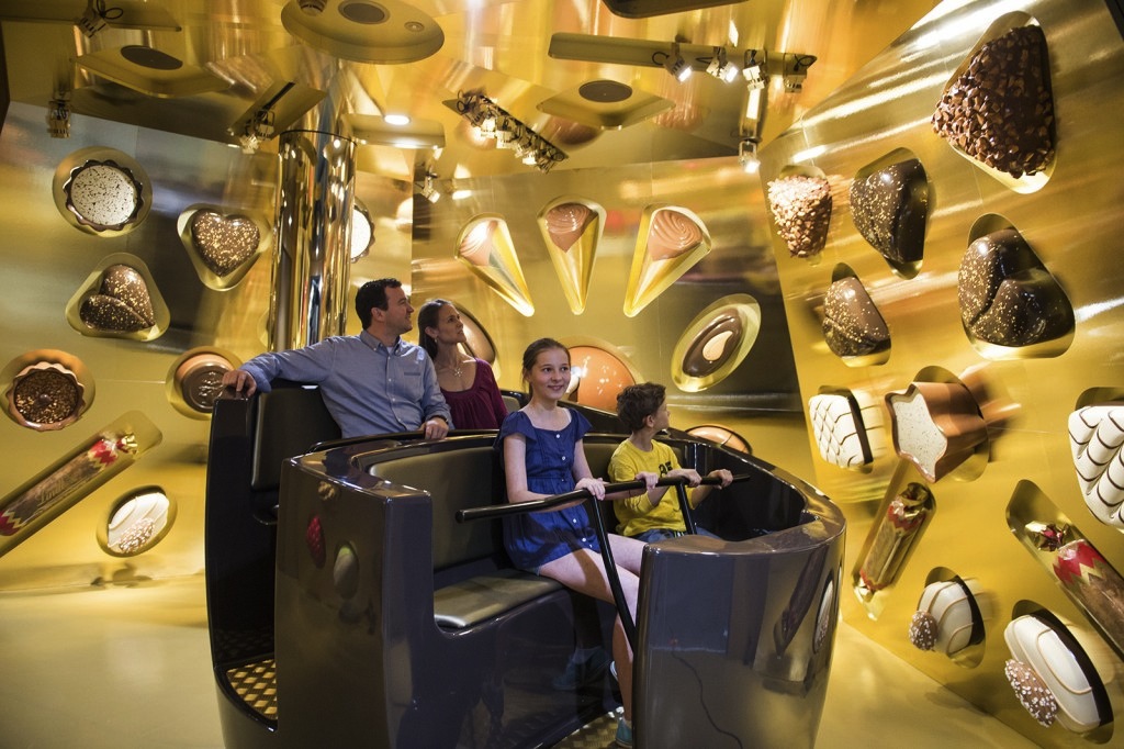 容器から出した後, 訪問者は10台の車両のうちの1台に乗ります (遊園地と同じようなもの) チョコレートの道を旅する. 旅を通して, 馬車はさまざまなテーマの部屋に停車します, また、大判の映写スクリーンの前で、この食品の専門家が高解像度の画像やビデオを使ってその調理方法を説明します。.