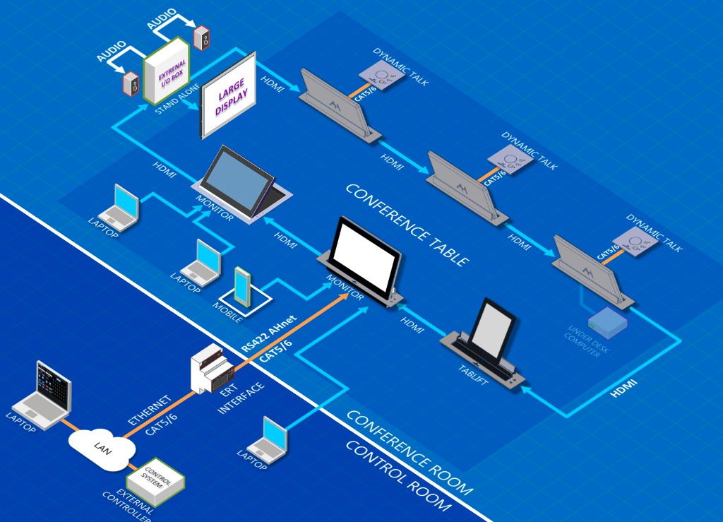 DynamicShare es un sistema de distribución de vídeo de alta definición que se integra en los controles de los equipos de la firma, todo en un solo cable. Esta solución flexible, fiable y fácil de instalar y utilizar, puede integrarse en todos los productos de la gama Dynamic de Arthur Holm, a modo de accesorio, como sus monitores retráctiles, abatibles, plegables y rotatorios.