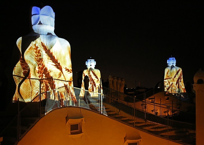 El recorrido llega a su punto álgido en la azotea, con un espectáculo de iluminación y sonido, de unos veinte minutos de duración, tan singular como el propio edificio en el que se realiza, “se trata de un hito en la museografía de vanguardia, ya que la proyección se realiza sobre cinco tragaluces de la azotea, の 7 metros de altura cada uno, y habitualmente el videomapping se ejecuta sobre superficies regulares -explican en la web de Grupo Transversal-, a lo que se añade además que se realiza sobre elementos escultóricos de volumetrías irregulares, como los famosos badalots (cajas de escalera), y a diferentes profundidades”.