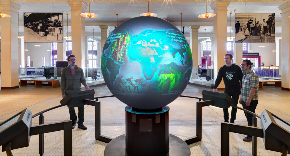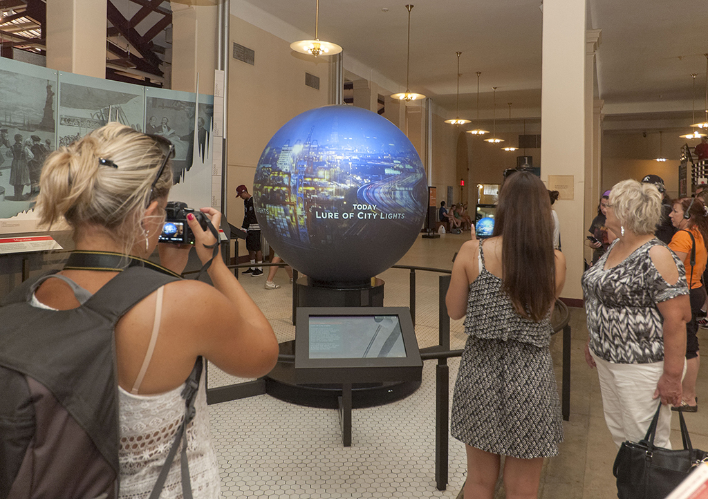 後で, en la zona de entrada, se encuentra el World Migration Globe, un globo acrílico de 1,5 metros donde el vídeo de alta definición se proyecta en el interior de la esfera para ilustrar los patrones de migración en los Estados Unidos y otros países del mundo. Junto con tres paneles LCD dinámicos que flanquean el globo, esta pieza central de la exposición representa el nuevo enfoque del museo.