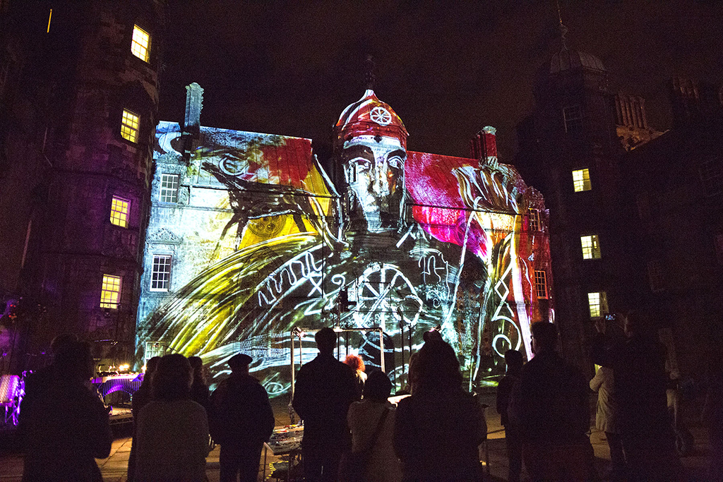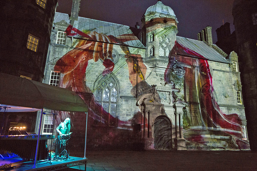 エディンバラ・フリンジ・フェスティバルをモチーフにしたデザイン 2015, 音楽が融合するショー, 絵画とビデオ投影, アニメーション, 現場に戻ります. 今回、ジョージ・ヘリオット・スクールは、パナソニックの技術を使ったプロジェクション・スタジオによるこの制作のために選ばれた建物です。.