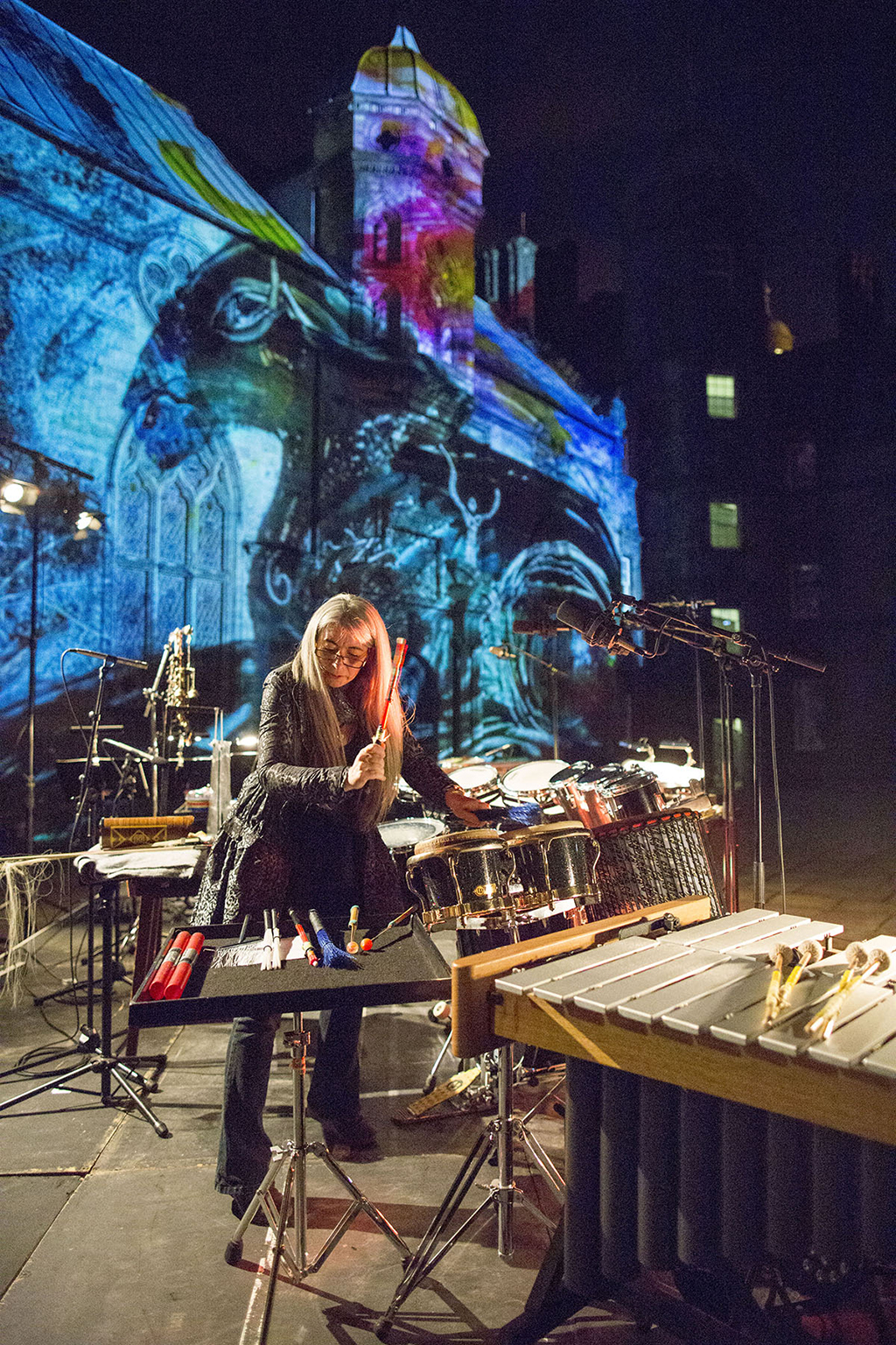 リアルタイムで作成され、生演奏とともに建築物に投影される絵画の力は、プロジェクション アーティストのロス アシュトンとのコラボレーションです。, 名手パーカッショニストのデイム・エヴリン・グレニーとビジュアルアーティスト兼画家のマリア・ラッド.