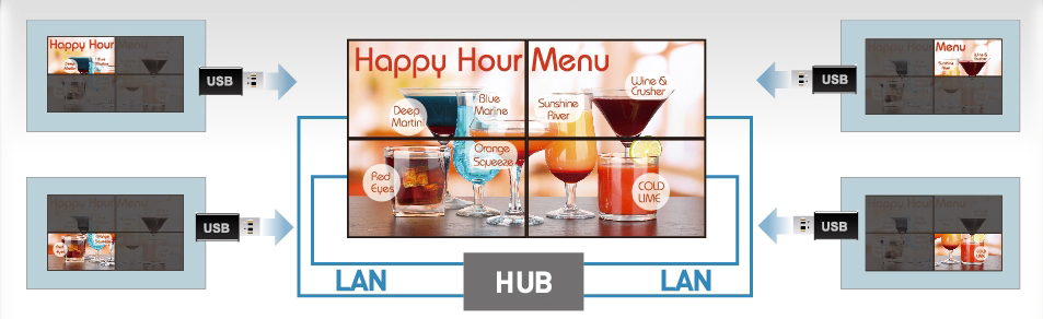 El uso de estas pantallas para fines de cartelería es tan sencillo como introducir el contenido desde una conexión USB sin necesidad de precisar un reproductor multimedia. Es posible visualizar vídeos e imágenes estáticas, lo que permite utilizar una gran variedad de contenido de señalización original.