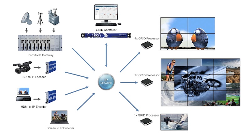 La incorporación de corrección de trama y bisel permite utilizar pantallas de cualquier tamaño de marco y el sistema no requiere de un procesador de vídeo central, ya que sólo utiliza la red IP para la distribución de las señales de vídeo, de manera que cada pantalla está equipada con su propio procesador (integrado o montado en su trasera) para decodificar simultáneamente múltiples flujos HD y 4K.