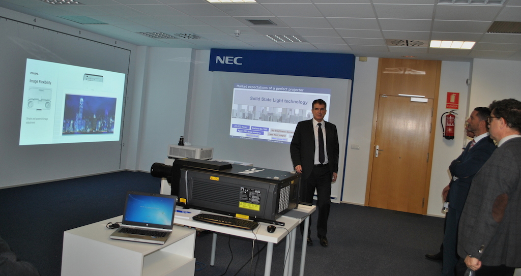 Profesionales del sector de la distribución audiovisual, como Tech Data Maverick, イングラム・マイクロ, Crambo o el portugués Esistemas (本社), y clientes del mercado Ibérico han acudido a la jornada de proyección láser de NECディスプレイソリューションズ, con un aforo al completo de la Sala Demo que el fabricante tiene en Madrid, para conocer en detalle y probar los nuevos modelos profesionales con fuente de luz láser, así como todo su portfolio con esta tecnología.