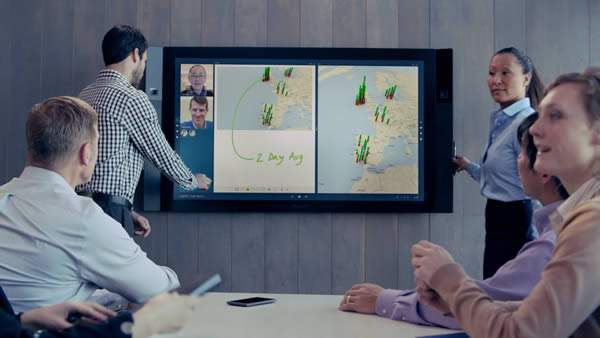 Surface Hub es un dispositivo provisto de una pantalla de gran tamaño y una novedosa tecnología táctil y de escritura. Windowsを搭載 10 y aplicaciones como Skype o OneNote, aportando una nueva experiencia de productividad para grupos, permitiendo involucrar tanto a personas que trabajan juntas como a aquéllas que se conectan de forma remota.