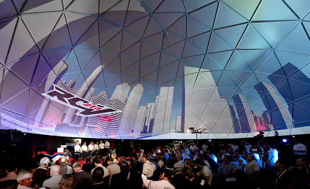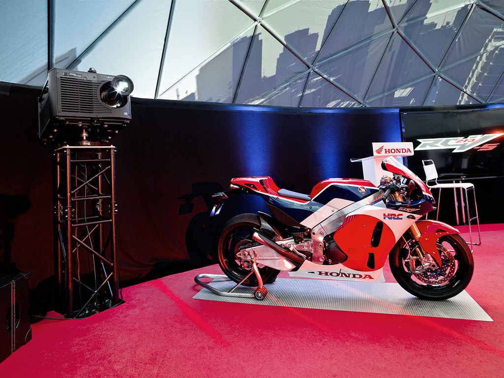 Una proyección inmersiva realizada en un domo geodésico de 16×8 地下鉄, 装備されている 6 proyectores Christie Roadster HD20K-J, consiguió recrear, de una forma muy realista, la atmósfera del motociclismo durante la presentación de la exclusiva moto RC213V-S de Honda.