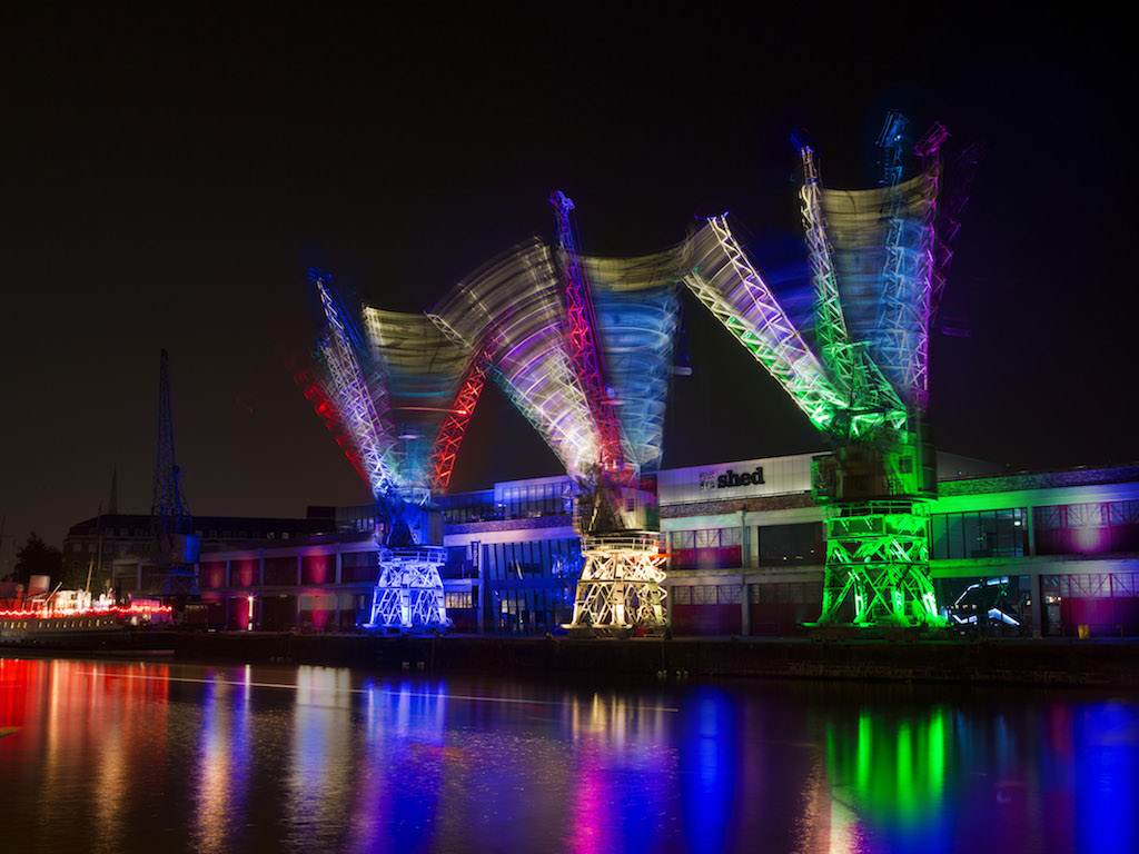 ブリストル ハーバー クレーン, これらは通常、イングランド南西部にあるこの都市のスカイラインで固定照明器具として機能します。, 彼らは音楽と完璧に同期した絶妙な照明の振り付けルーティンで活動に戻りました。. いわゆる「クレーンダンスブリストル」は、ボートの見事な組み合わせのおかげですべての出席者を驚かせました, 合唱団, ライブ音楽と動くイルミネーションクレーン, ブリストル M シェッドのエンジニアによって運営および修復されました。.
