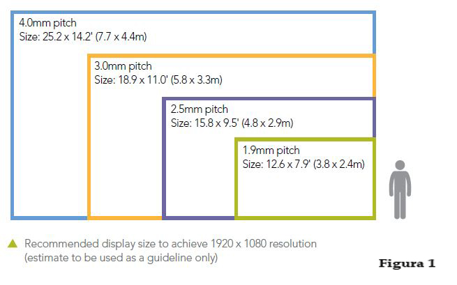 No existen normas claras y precisas en relación a las distancias de visionado óptimas para cada distancia entre píxeles. しかし, en la Tabla 1 listamos algunas recomendaciones. La mejor distancia de píxel para una aplicación determinada será aquella en la que la visión de los píxeles no resulte molesta a una distancia de visionado normal, pero que permita al display acotar una porción significativa del campo de visión del observador para obtener el máximo impacto a la resolución proyectada.