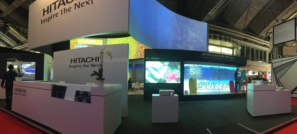 El stand de Hitachi cuenta con un potente despliegue de color en proyecciones curvas y visualizaciones realizadas con equipos como el CP-WU8700, CP-WX8750, CP-WU9100 y CP-HD9950 que muestran imágenes brillantes e incorporan características mejoradas como blending y warping y gestión de color.