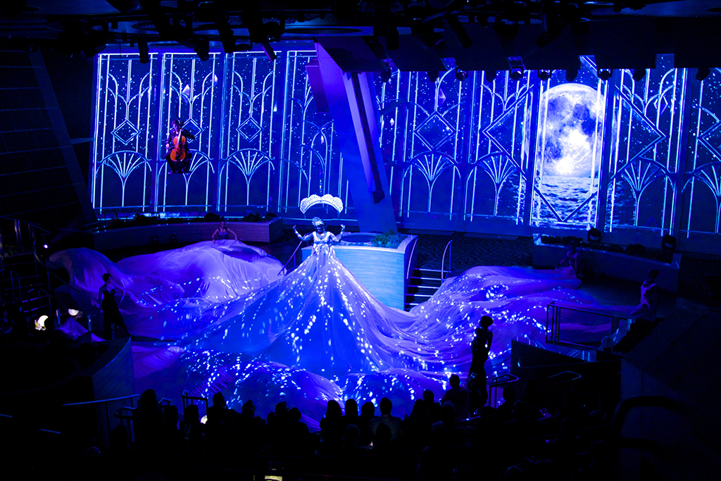 En el interior de este trasatlántico se han creado dos teatros donde cada día se ponen en escena diferentes espectáculos musicales en los que tienen un papel protagonista las técnicas audiovisuales.