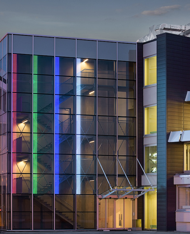 Esta solución permite la sustitución de cada acristalamiento individualmente a través de un conector que cambia de forma más estética un cable. その上, la integración de un componente óptico en cada Led impide toda reflexión interna (<0,01%), evitando así cualquier incomodidad o molestia a los residentes cuando se ilumina la fachada.