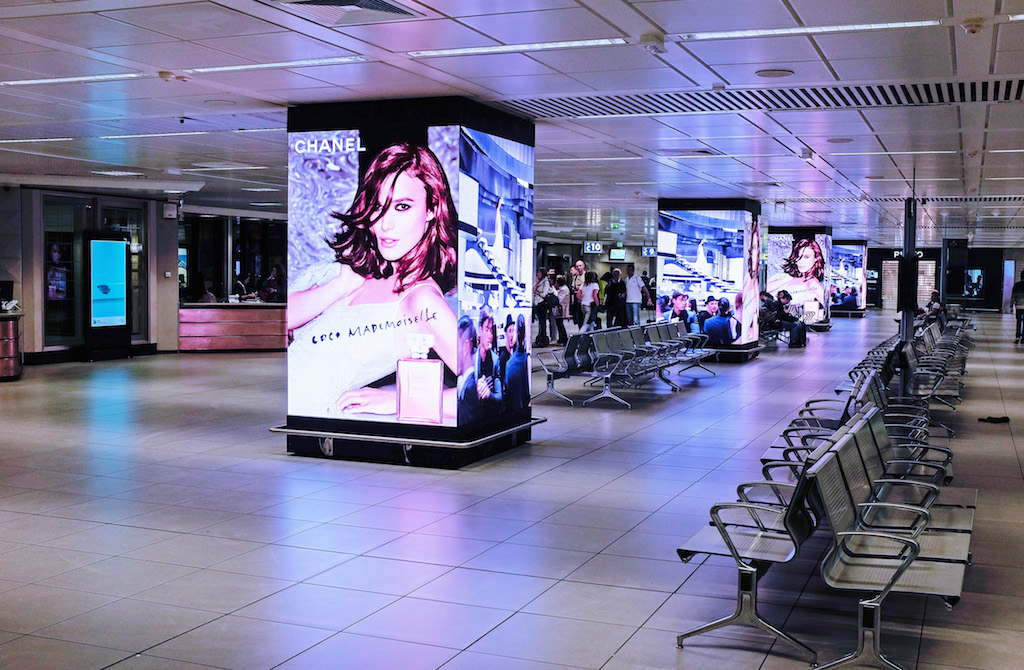 例えば, la puerta C del aeropuerto la protagonizan cuatro grandes columnas digitales (その周り 61,44 平方メートル) reservadas exclusivamente por la firma Chanel para mostrar en las cuatro caras del panel Led Absen A2s sus selectos productos “con un efecto espectacular en imagen y contenido, sin costuras”, afirma Goldsmid.