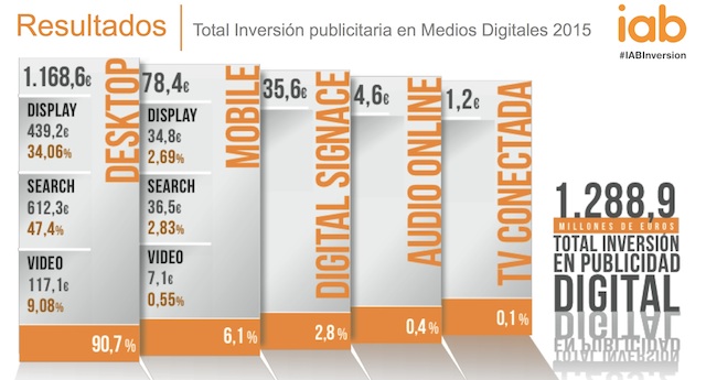 El dato total de inversión en publicidad digital en 2015 ha sido de 1.289,2 百万ユーロ, cifra que incluye la inversión desglosada en desktop (1.168 百万ユーロ); 携帯 (78,4); デジタルサイネージ (35,6); audio online (4,6) y TV conectada (1,2 百万), lo que significa un crecimiento del 21% 前年と比較して. La publicidad digital, como se destaca en este estudio, representa un share del 25% respecto al total de la inversión publicitaria, consolidando su segunda posición en el ranking de medios.