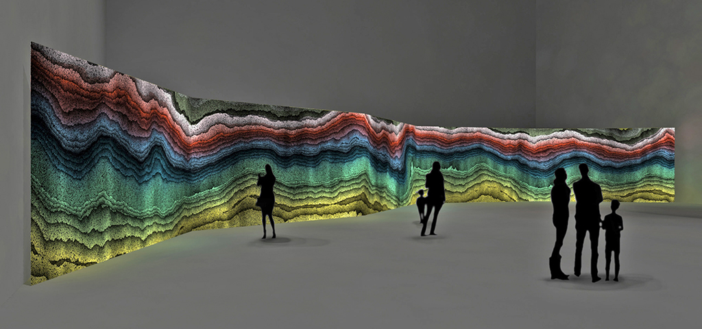 ‘Earthworks’ proyecta gráficos animados de alta definición que representan el movimiento de los estratos de la tierra hasta el más mínimo detalle. Capas que se funden y separan en un movimiento constante, impulsado por datos sismográficos extraídos de fenómenos como terremotos, volcanes y glaciares, y convertidos por el dúo de artistas británicos en un flujo de sonido envolvente.