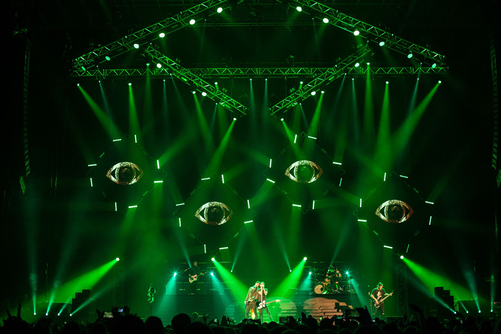 あなたの制作のために, パンク・ロック・バンド、オール・タイム・ロウがコンサートで使用した 32 Pan and Tilt Elation ACL で 360° 連続回転する LED バー ユニット 360 バー. 一部はダイヤモンド型の LED ビデオ スクリーンの周囲にありました。, ステージの後ろにあります, ディスプレイが移動したときに生成されるさまざまな視覚効果を可能にする.