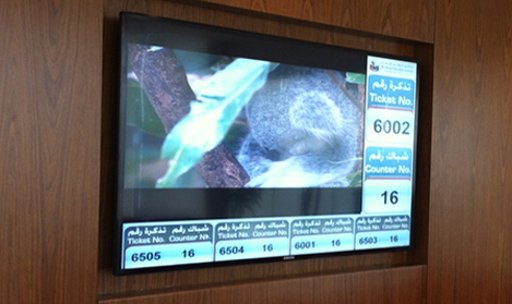 待ち時間中に来場者の注意を引くため, 各応接スペースには 15 台の LED スクリーンとスピーカーが設置されています, また、チケットに記載されている各来場者に割り当てられたサービス番号もアナウンスされ、各待合室のディスプレイに表示されます。.