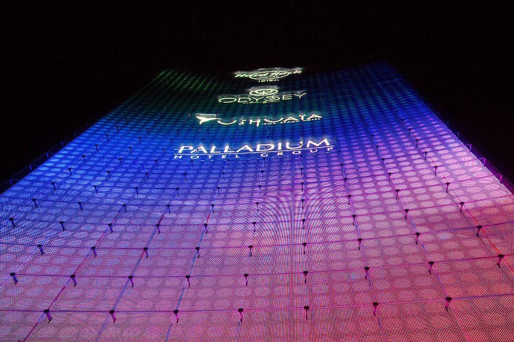 すでに分析されているように デジタルAVマガジン, この巨大な凹型の外装高精細 LED スクリーン, 設計された, によって製造および設置されました 導かれた夢, これは、MCM グループと GEM が開発した共同プロジェクトの成果です。, の所有者 パラディウム ホテル グループ この施設が属する, あなたの会社を通じて オデッセイ レッズ グループ, フィエスタホテルズが参加 & リゾート, バレアレス諸島に拠点を置く.