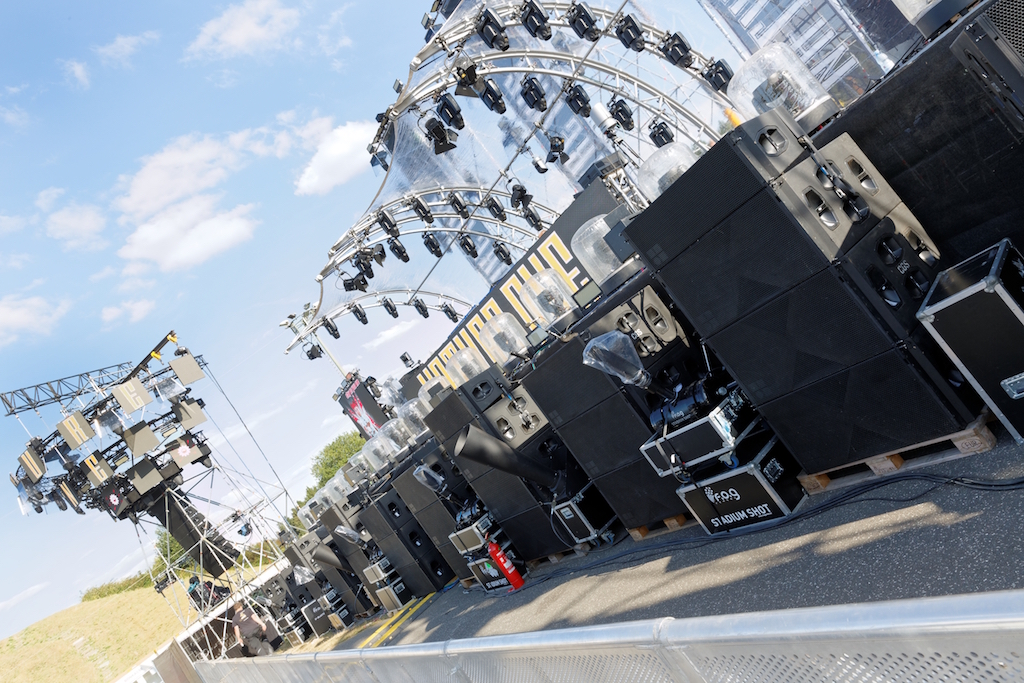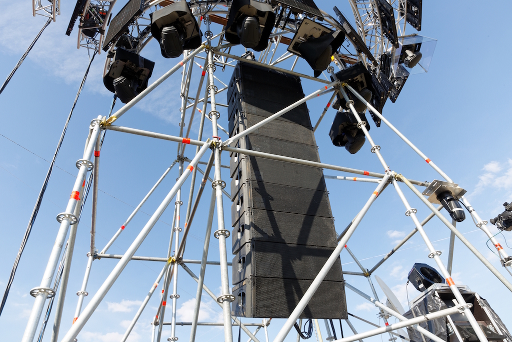 El equipo técnico instaló 36 J-SUBs, colocados en stack a lo largo de doce conjuntos de tres de alto, con los dos stacks finales orientados hacia el exterior para crear la distribución del nivel de presión deseada. その上, utilizaron cuatro J12s sobre los subwoofers como nearfills, desplegados a lo largo del borde frontal del escenario, así como elementos de la Serie Y para las tareas de monitorización.