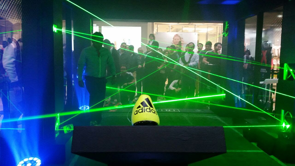 La acción, denominada Adidas Laser Challenge, se realizó en el centro comercial Santafé, uno de los más grandes del país, localizado en Bogotá, y consistía en un túnel con obstáculos de rayos láser que los participantes tenían que atravesar en un tiempo determinado, sin tocarlos. La idea estuvo inspirada en la película Entrapment (La emboscada en Hispanoamérica), con Sean Connery y Catherine Zeta-Jones, que contiene una escena donde la actriz estadounidense protagoniza una experiencia similar en un laberinto de láseres.
