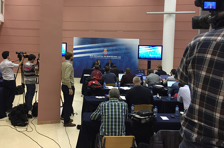 Los accionistas del RCD Espanyol celebraron su junta ordinaria el pasado 13 de diciembre en el Auditori de Cornellà de Llobregat (バルセロナ) y para su realizaron, あと一年, 私は fue la responsable de proporcionar el equipamiento audiovisual. 加えて, también se encargo del montaje, realización en directo y regiduría del evento, tanto para el auditorio como para la sala de prensa.
