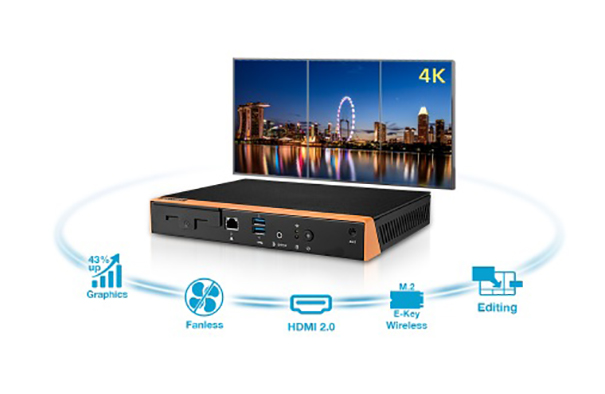 Su diseño HDMI 2.0 es compatible con 4K hasta 60 fps, lo que permite una resolución de 4.096×2.160 junto con un mayor contenido en 2D de velocidad de fotogramas. También dispone de una interfaz de I/O que incluye 3 HDMI, 2 RJ-45 (Giga LAN), 4 プエルトスUSB 3.0, un RS-232, puerto de audio y m.2/Mini-PCIe para la conexión inalámbrica y dispositivos interconectados en IoT.