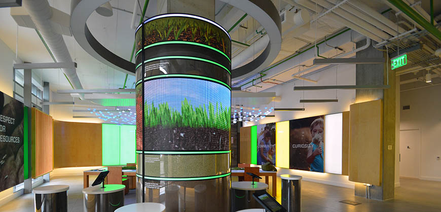 Este soporte digital de 360 grados ha sido diseñado para ser integrado en una columna de hormigón ubicada en el centro de la sala, que se encuentra conectado a tres iPads, montados en pedestal, desde donde los usuarios navegan por las fotos, vídeos e información agrícola que es visualizada en la pantalla de Nanolumens.