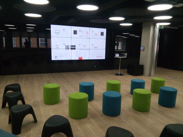 En esta sala se ha instalado también un sistema de distribución inalámbrica de señales HD desde diferentes fuentes que facilita la realización de presentaciones de grupo más dinámicas donde cada miembro puede aportar contenidos en distinto formato y dispositivos. Se ha instalado además infraestructura AV de alta capacidad y múltiples puntos de conexión AV HD distribuidos por toda la sala, permitiendo una configuración más polivalente.
