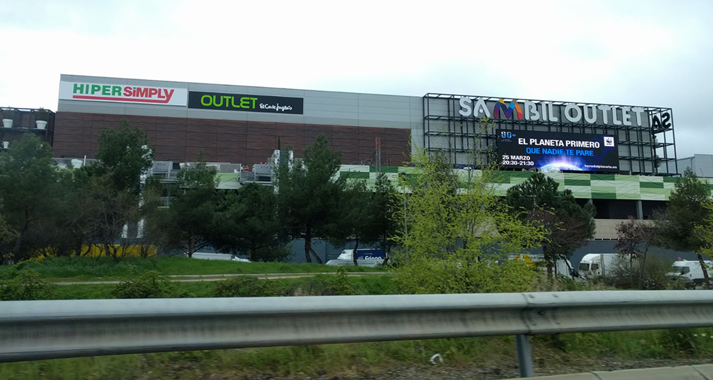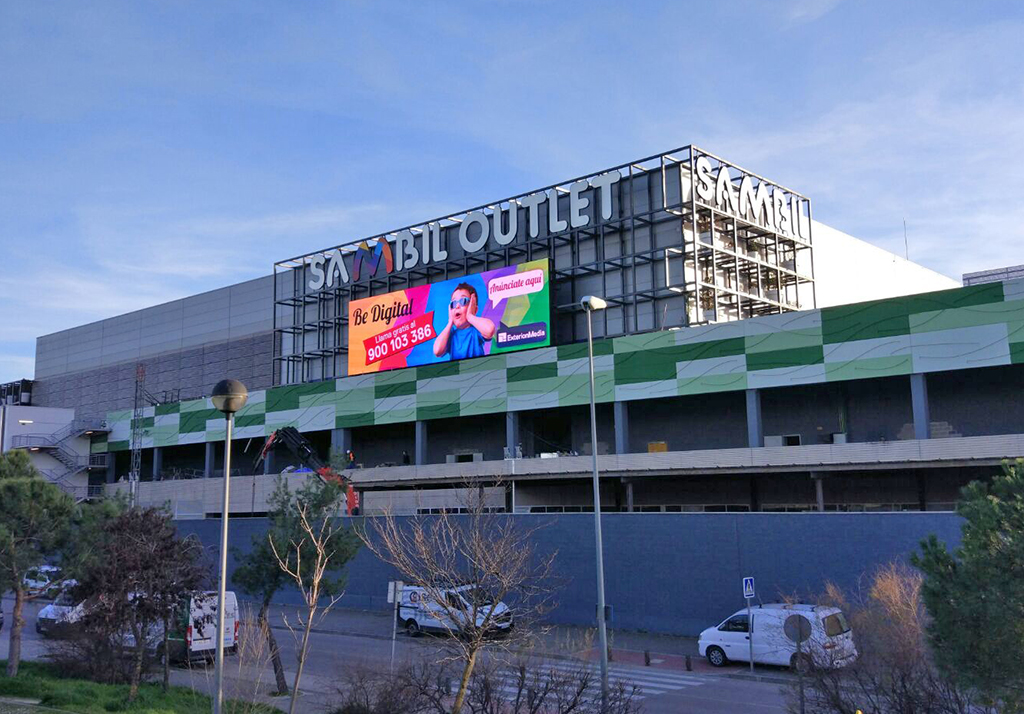 En la fachada Norte del Sambil outlet tiene instalada una pantalla Led outdoor de 116 平方メートルおよびピクセルピッチ 16 mm, lo que le permite proyectar contenidos de 1.260×360 píxeles con un elevado brillo.