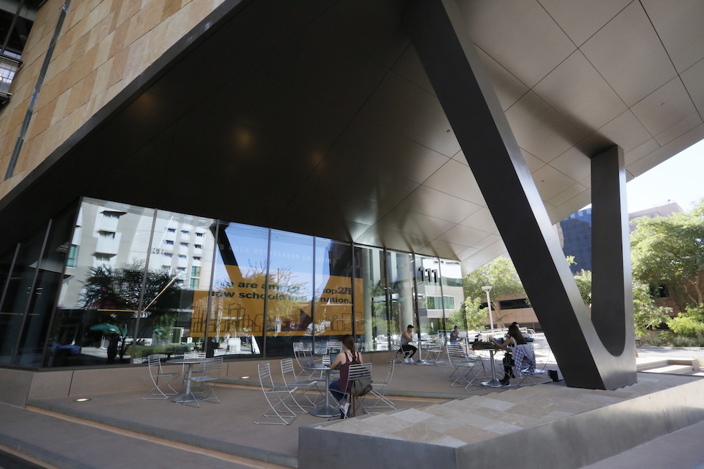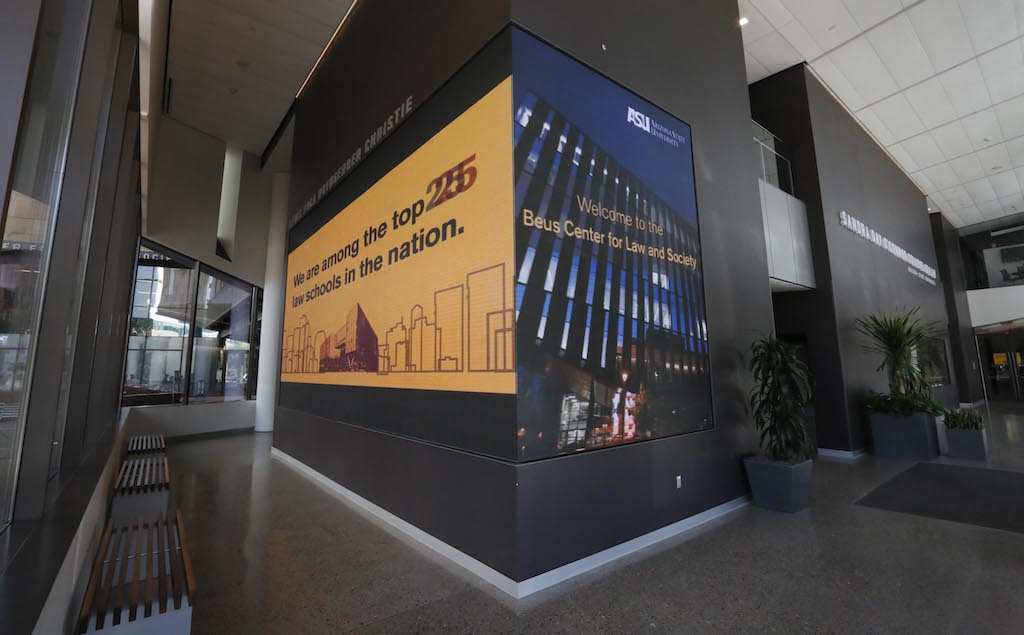 建物の内壁が、外から通行人に視覚的な印象を与えるために使用されることはあまりありません。, まるでフェニックス・スクール・オブ・ローの新しく改装されたロビーのよう (ベウス法律センター), アリゾナ州の公立大学に所属, 内部に高解像度のLEDスクリーンを設置, このスペースの大きな窓を通して、外から完全に鮮明に見ることができます.