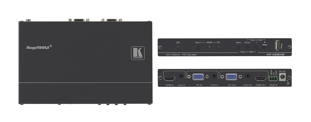 El VP-426H2 de クレイマー ofrece un escalado 4K real para espacios de reunión sencillos. Un equipo compacto que admite HDMI y VGA e incorpora escaneo automático de entrada.