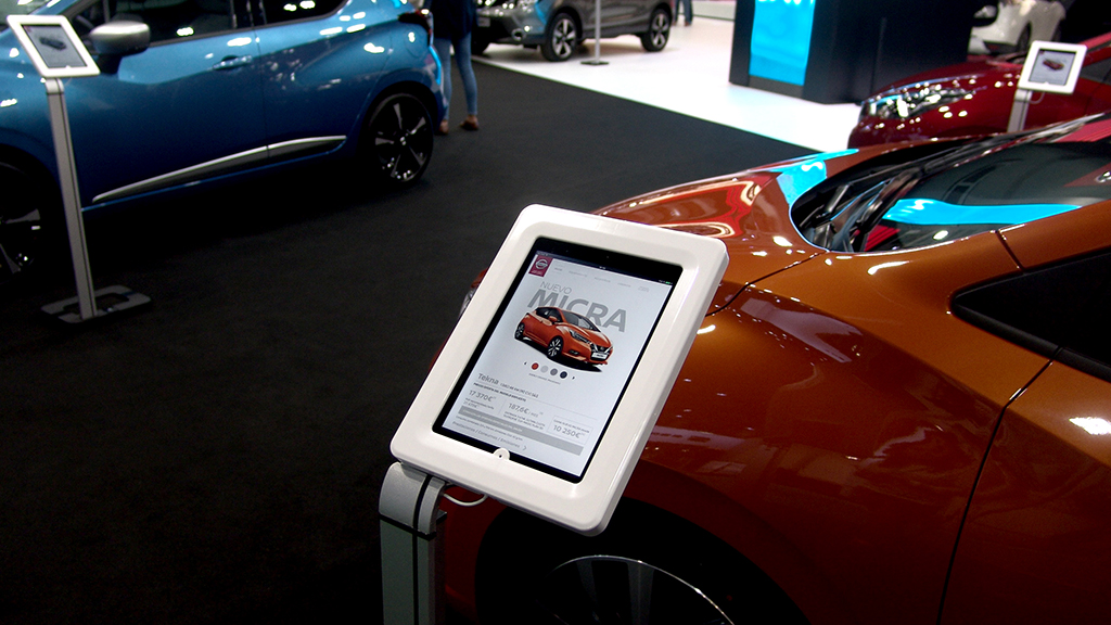 Para la información de cada modelo se ha colocado junto a cada vehículo un soporte con un iPad, 21 合計で, donde se podían consultar todas las especificaciones. En la zona de vehículos eléctricos, dónde todo estaba alimentado con la batería del Nissan Leaf, se colocaron dos monitores de 75 pulgadas gestionados con ブライトサイン.