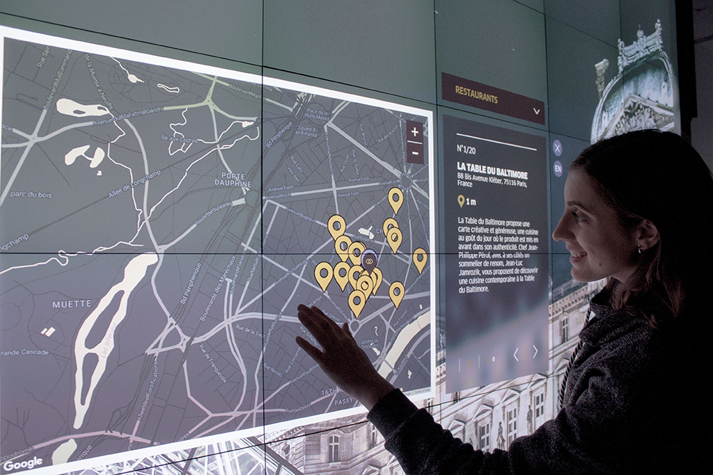 El sistema de gestión de contenido permite al personal del hotel personalizar la información del videowall, incluida la creación de itinerarios a medida a través de París, que se pueden descargar en los teléfonos móviles de los huéspedes.