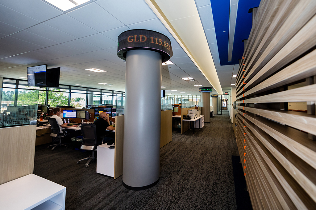 “Cuando la gente piensa en la industria financiera automáticamente se imagina una oficina de Wall Street con monitores, televisores de todo y ticker feeds constantemente ejecutando las últimas cotizaciones de valores. Ese es el ambiente que queríamos recrear en nuestro edificio comercial de Carolina del Sur.