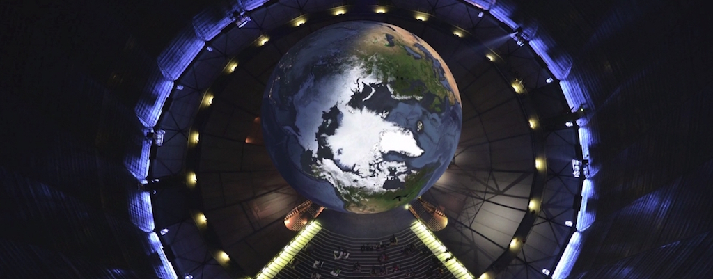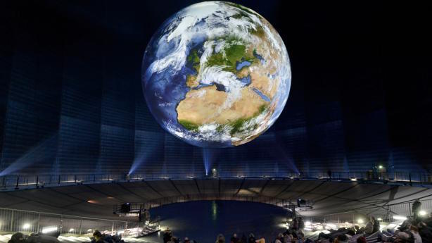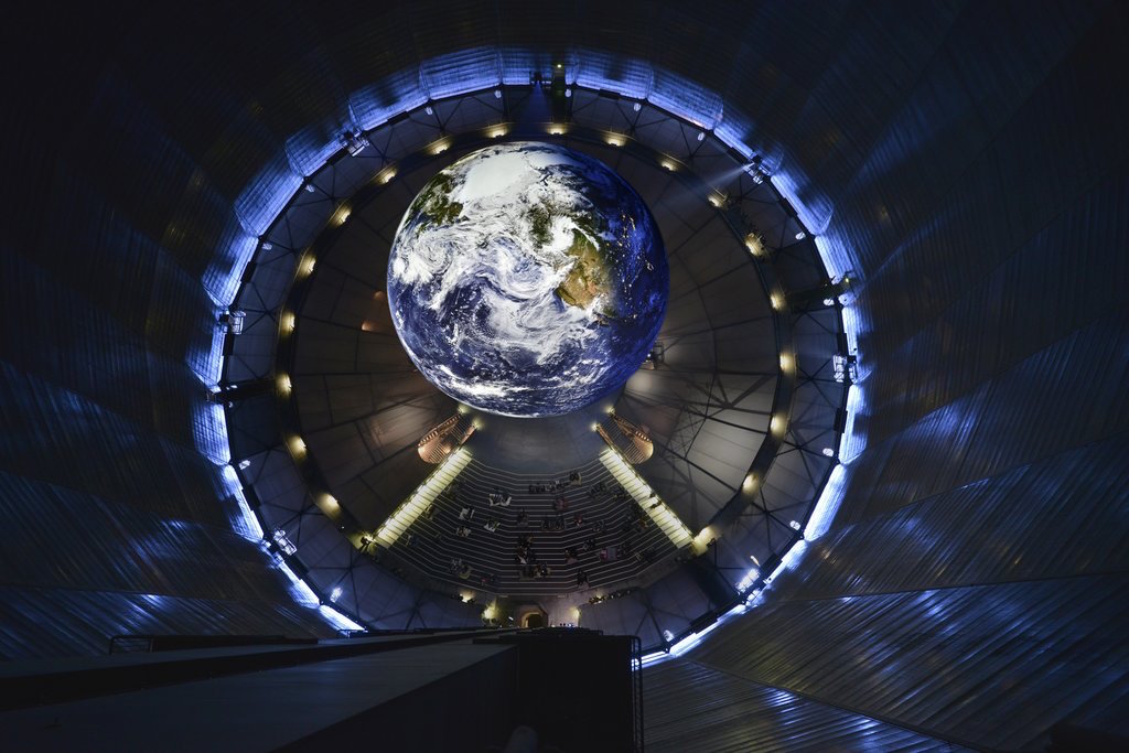 El elemento central de esta exitosa exposición es un globo de 25 地下鉄, suspendido en un espacio de 100 高さメートル, diseñado por Intermediate Engineering, donde la proyección láser es un elemento fundamental para representar la Tierra a partir de impresionantes imágenes de satélite de alta resolución, obtenidas gracias a la colaboración del Centro Aeroespacial Alemán (DLR).