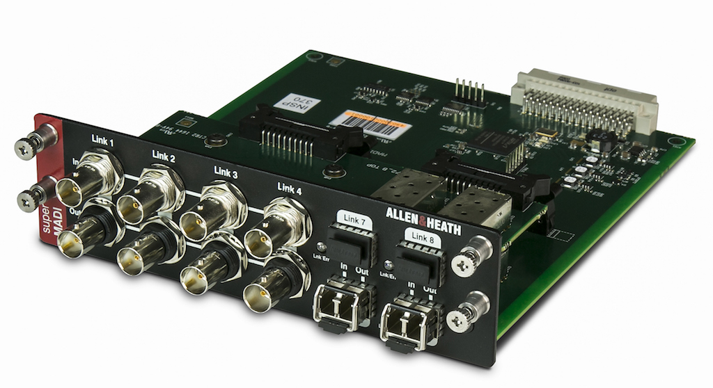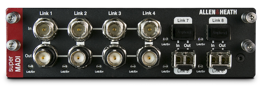 Diseñada para ayudar a integrar dLive en una amplia gama de aplicaciones de broadcast, sonido en directo y grabación, la tarjeta SuperMADI ofrece numerosas posibilidades de conectividad, incluyendo ocho conectores BNC y cuatro ranuras SFP para transceptores de fibra óptica.