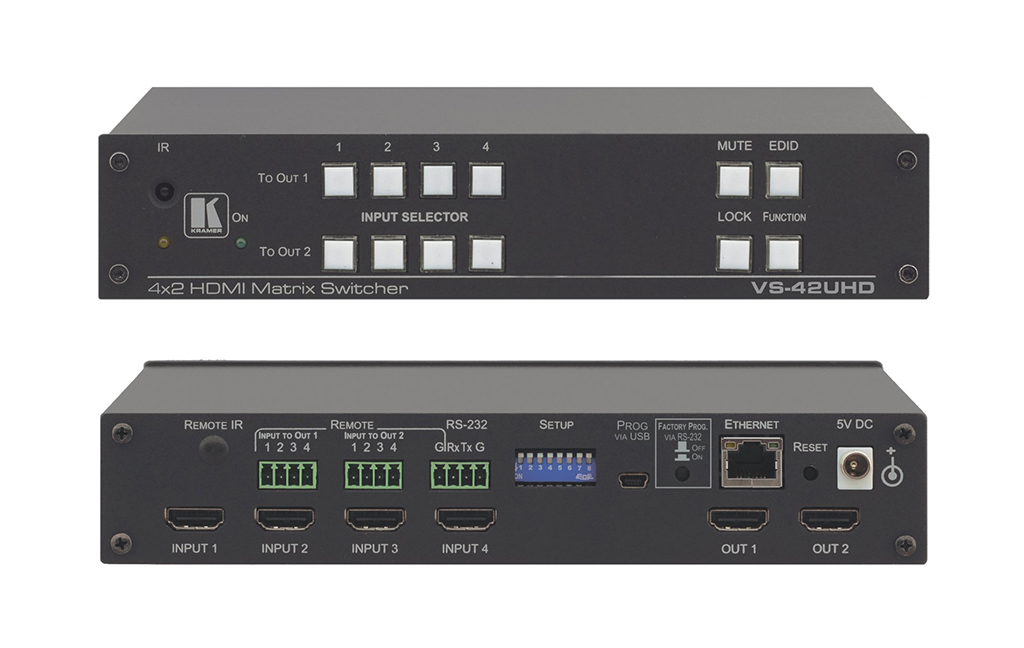 VS-42UHDは2台設置可能なコンパクトデスクトップパソコンです。, 隣り合って, オプションの RK-1 ラックアダプターを使用して 1U ラックスペースに設置可能. 4K@60Hz HDMI信号用マトリックススイッチャー (4.2.0), 信号を再生成してイコライズし、任意の入力を一方または両方の出力に同時に切り替えることができます。.