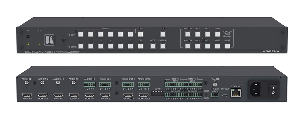 VS-62Hは、従来品と同等の速度でデータ転送が可能で、同解像度の信号に対応した4Kルーターです。. それは持っています 6 HDMI入力と2つの出力コネクタ. 統合された Web ページ コントロールを備えた小型デスクトップを備えており、完全なシステム構成が可能です, プラス Kramer P3000 プロトコルとフロント パネル コントロール.