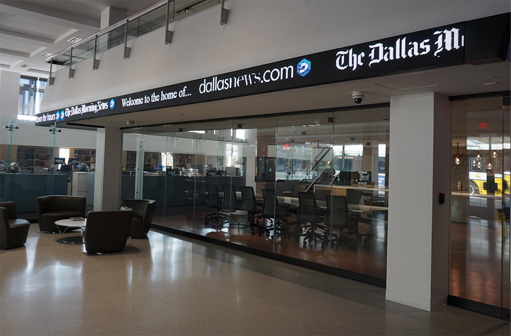 彼 Dallas Morning News ha brindado historias y comentarios de última hora a los residentes del área de Dallas-Fort Worth durante más de 130 年. En la histórica sala de redacción, 組み込まれている 1951, se realizó, 最近, una renovación tecnológica con la integración de una pantalla Led ナノルーメン Nixel Series de 22,8×0,6 metros y un pixel pitch de 6mm. Este display sirve como un ticker de noticias 24/7 donde se muestran los últimos titulares de la organización.