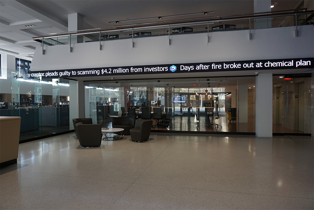 El Dallas Morning News ha instalado en la sala de redacción una pantalla Led Nixel Series de 22,8×0,6 メートルとピクセルピッチ 6 mm. Una solución que funciona 24/7 y en la que se muestran los titulares de las últimas noticias.
