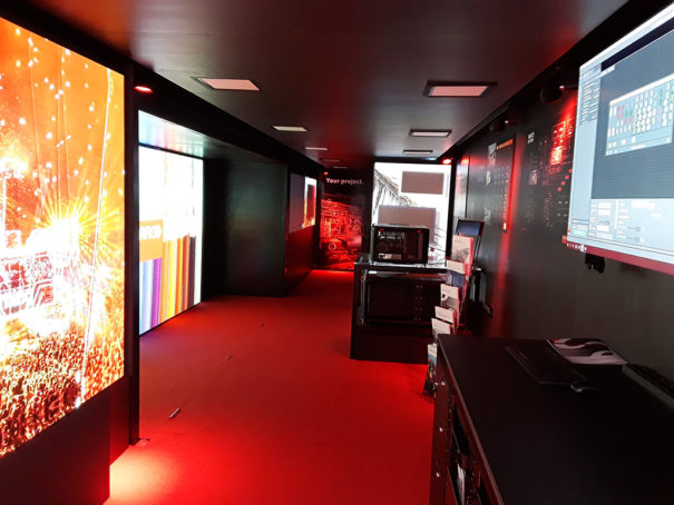 En este camión, que lleva tres meses de gira, se pueden ver las características de los proyectores profesionales láser UDX, F80 y, el más novedoso, el G60 w8.