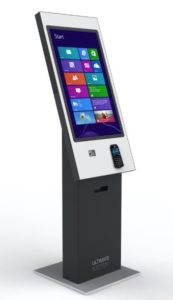 El quiosco Serie V70º de Ultimate Kiosk cuenta con una pantalla vertical de 32” de Samsung, con diseño ultra estrecho tipo tableta, con inclinación de hasta 70 grados para ofrecer mayor privacidad al usuario en servicios como pagos, チケットの購入, 等,