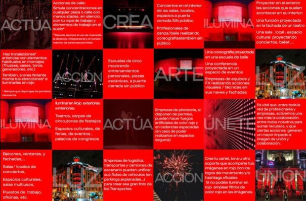#LightItInRed: se iluminarán en color rojo fachadas, balcones, ventanas, y exteriores en general, así como el interior de teatros, salas de conciertos, espacios culturales, salas multiusos, espacios de ferias, palacios de congresos, espacios para eventos, zonas de festejos, carpas de circo, locales de ensayos, estudios de grabación, 等, e incluso puestos de trabajo, oficinas y casas, utilizando el lema #RedAlert #WeMakeEvents, que en España será #AlertaRoja #HacemosEventos.