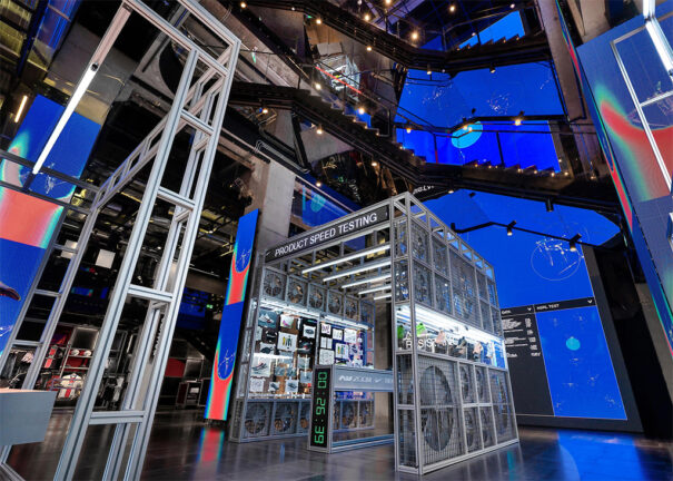 La capacidad de realizar configuraciones en ángulo hace que este modelo haya sido utilizado como ‘recubrimiento’ de siete de las columnas que hay en esta House of Innovation 002. Cada una de ellas cubre una columna de hasta 6,5 metros de altura y un metro de ancho con pixel pitch de 3,9 mm.