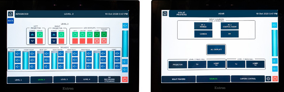Un procesador de control IPCP Pro 350 de Extron, situado en la sala de control, se encarga de las funciones del sistema AV de la mezquita en respuesta a las selecciones del usuario introducidas en los paneles táctiles.