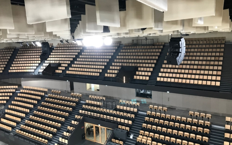 En la Sala Pegasus, donde pueden reunirse hasta 2.000 personas para una amplia variedad de eventos, deportivos y de espectáculos, se han dispuesto dos grupos cada uno con cuatro módulos de arreglo en línea GEO S12. Estos cubren el terreno de juego, その間 4 cabinets de fuente puntual PS15 cubren los asientos del soporte.