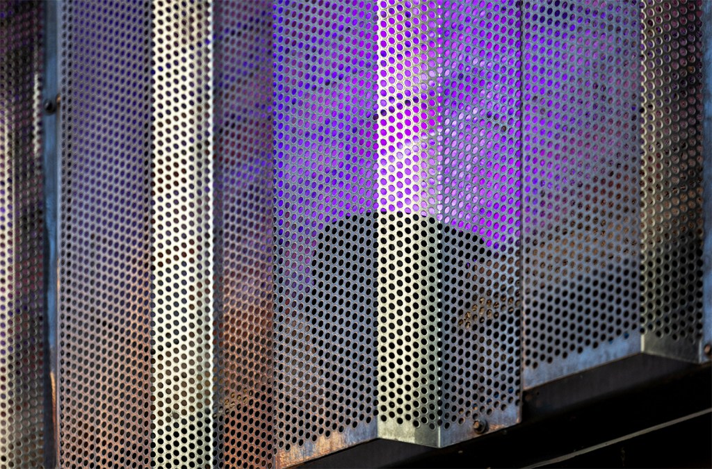外観のファサードは、モダンなガラス構造との視覚的共生が特徴です。, 百年前の古いレンガとそのすぐ隣にある金属フェンスの工業デザイン, さまざまな色や形で. この表面では合計 35 フォコス スタジオ PAR TRI 12 IP , 保護等級IP65により、屋外での恒久的な運用向けに設計されています。.