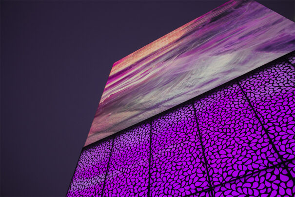 Un segundo espacio es la fachada digital dinámica realizada sobre paneles troquelados. によって設計されました Lumalia Studio, compañía del grupo Led Dream, la fachada extiende la pantalla Led en un juego de sincronía y contraposición, ampliando el contenido de video en ocasiones, y contrastando con gamas cromáticas y lighting en otras.
