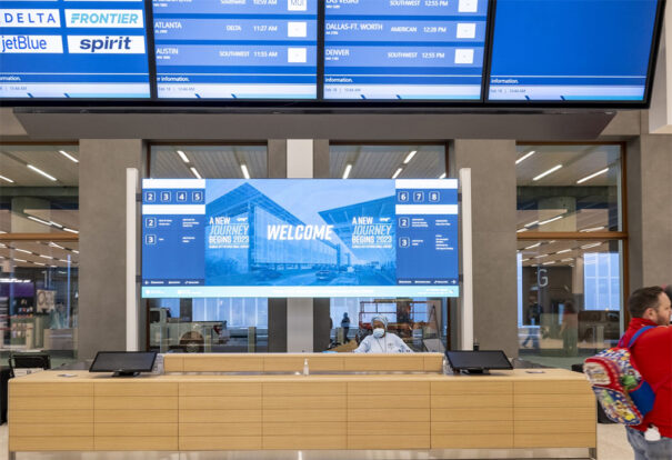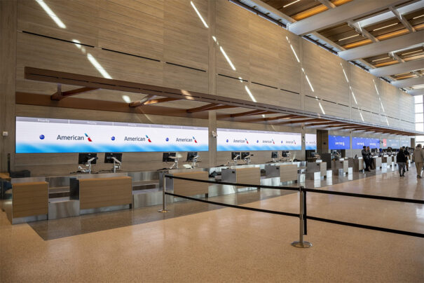 Además del contenido en bucle de la marca de la aerolínea, sobre cada mostrador aparecen mensajes de estado para dirigir a los viajeros a áreas de servicio específicas. Cada aerolínea tiene un contenido personalizado detrás de su mostrador.
