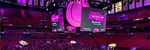 Las pantallas Led de Daktronics pueden integrarse para mostrar contenidos coordinados y ofrecer una experiencia visual totalmente conectada. La pantalla de la sala cool-down room es capaz de zonificar el contenido de forma variable, lo que permite mostrar varias zonas de contenido, si así se requiere.